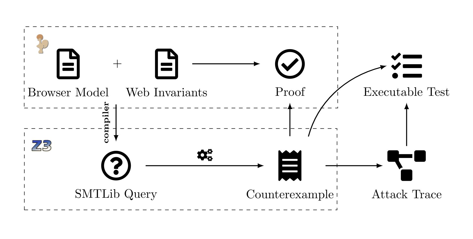 coq: formal proof management system components: cookies, CORS invariants: ex. "If a response from the server contains a security policy, then the browser enforces that specific policy" toolchain: - compiler translates browser model and Web invariants into SMT-lib formulas - then checked by Z3 automated theorem prover
